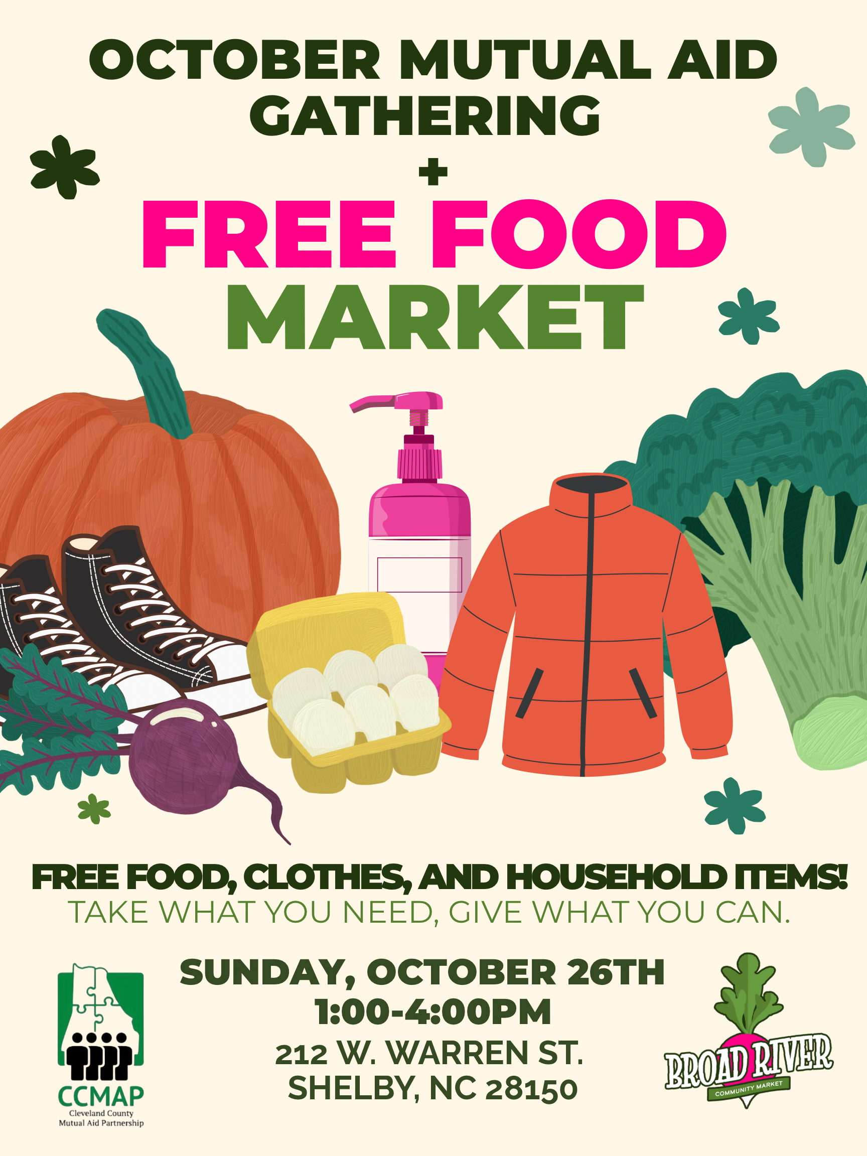 Join us and Cleveland County Mutual Aid Partnership at 212 W Warren St! We will have clothes, hygiene items, household items, and food.